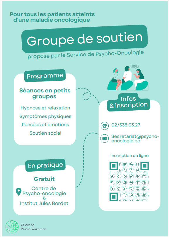 Les groupes ont lieu au Centre de Psycho-oncologie a.s.b.l. au 106, boulevard de Waterloo, 1000 Bruxelles, ils sont constitués de 3 à 8 personnes et ils sont gratuits.